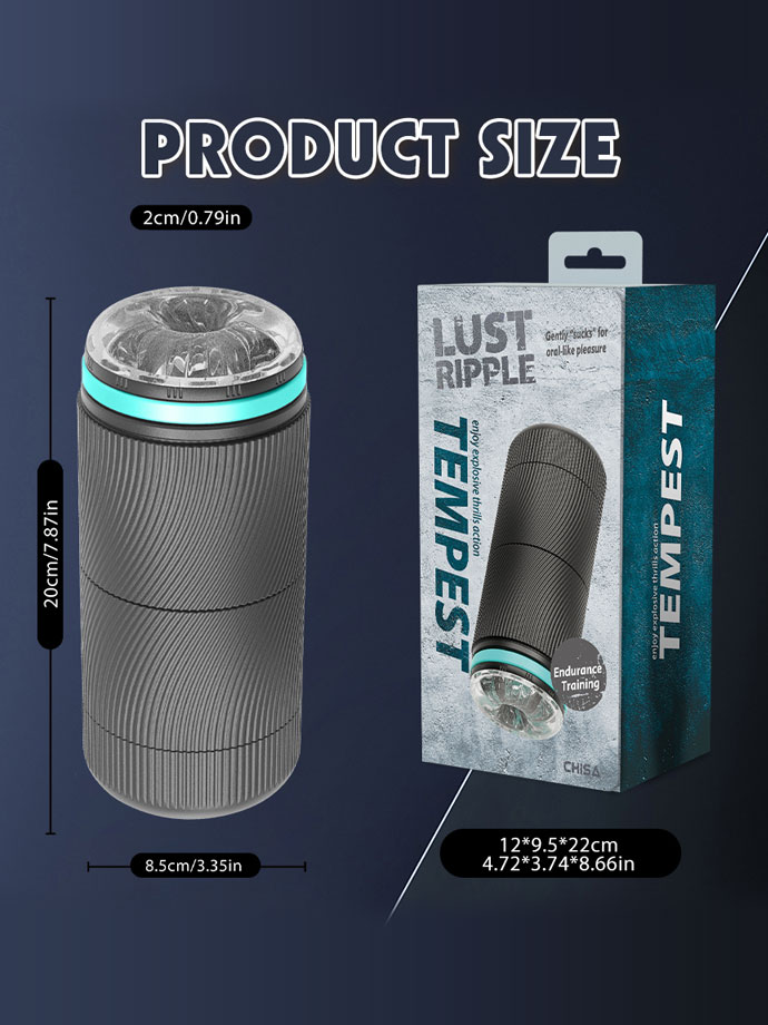 Im Inneren erwartet dich ein durchsichtiger, weicher Sleeve aus hautfreundlichem, elastischem TPE-Material, das nicht nur wie echte Haut wirkt, sondern sich auch genauso anfühlt. Durch das Auseinanderziehen der schwarzen Außenschale hast du plötzlich das Gefühl, dass sich der Masturbator an deinem Penis festsaugt, dich einsaugt, wie ein echter Mund, der dich tief aufnimmt und leidenschaftlich verwöhnt. Mit jedem Stoß erfährst du neue Reize. Diese raffinierte Funktion macht den Lust Ripple Tempest zu einem der realistischsten und intensivsten Toys auf dem Markt.