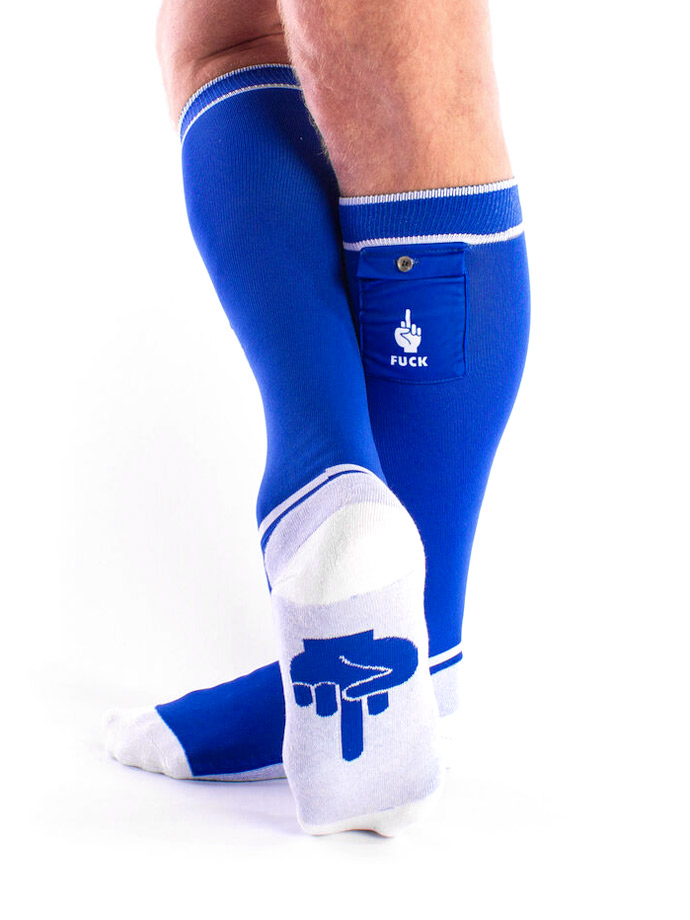 Mit den kniehohen blauen Party Socken von Brutus kannst du dein Fetisch-Outfit ideal vervollständigen. Eine freche Hand mit Mittelfinger und "Fuck" Schriftzug ziert die Vorderseite, die Ferse und die kleine Tasche an der Außenseite. Diese können mit Poppers, Kondomen, kleinen Gleitmitteln und anderen Accessoires, die du unterwegs schnell brauchen könntest, befüllt werden.